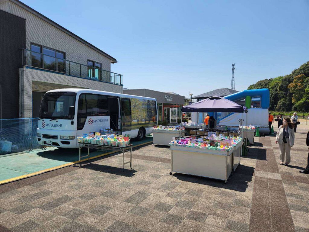 広い会場の一画にマッピー号を停車させ、周りには人気の選べるガチャガチャを約100カゴ展示、更にデパートでも人気の横浜の「かをり」のレーズンサンドやブランデーケーキや有名メーカーのお煎餅セット、更に地元の苺農家の若手起業家阿田智貴( 30 )さんの自慢の苺詰合せなども陳列し、訪れた親子連れに販売しました。小さな子供さんはマッピー号に強い興味を抱き、お父さんと一緒に車内探訪をする場面もしばしばありました。会場では子供たちを喜ばすナンバーワン戦隊ゴジュウジャーショーや空気を入れて空間を楽しむふわふわリニアアスレチックなどの企画イベントが催されました。