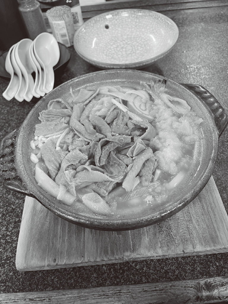 程なく私の目の前にも鍋が置かれた。まるで火にかけられているかのように、汁の表面で小さな破裂が続いている。湯気と共に、みそとニンニクの香りが漂った。肝心の豚もつは、探すまでもなく豪快に乗せられている。