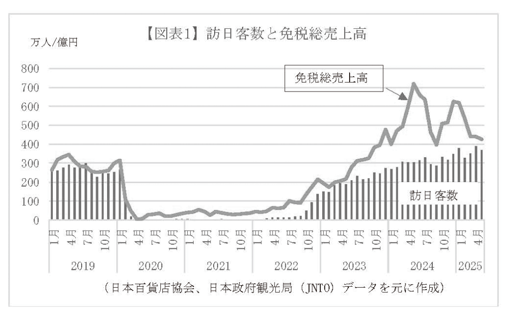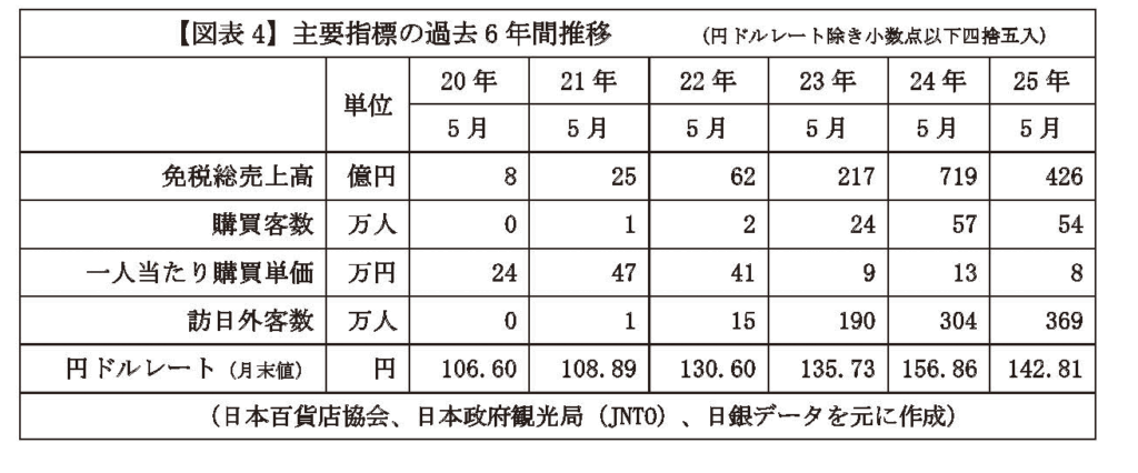 日本を訪れる観光客は2割以上の伸びが続いているものの、為替円レートが24年の150円台半ばの水準から140円台前半に円高に推移して日本で消費するメリットが小さくなり高級ブランド品など高額品への慎重姿勢が強まったことや、訪問場所や買い物のしかたが多様化したこと、特に24年は高級ブランド品の値上げ前の駆け込み需要などから高額品を中心に売り上げが23年の3.3倍に急伸した反動が起きたことが原因である。