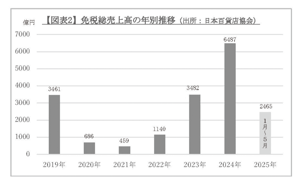 ただ、今年の1月〜5月のインバウンド売上高合計は2465億円であり、5か月でおととし23年の売上高3482億円の7割を超えており依然として23年比では高い水準が続いている。