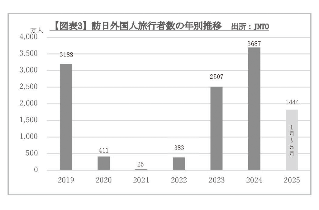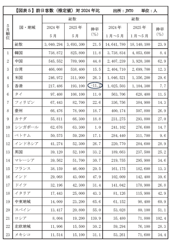 5月は桜シーズンと夏休みの間で例年落ち着く時期であるが、祝日、スクールホリデーに合わせて訪日需要が高まり中国、フィリピン、米国を中心に訪日客数が増加した。これで25年1月〜5月の合計数は1814万人となり5か月で昨年の3687万人のほぼ半数に達した勘定となり順調に伸びている。