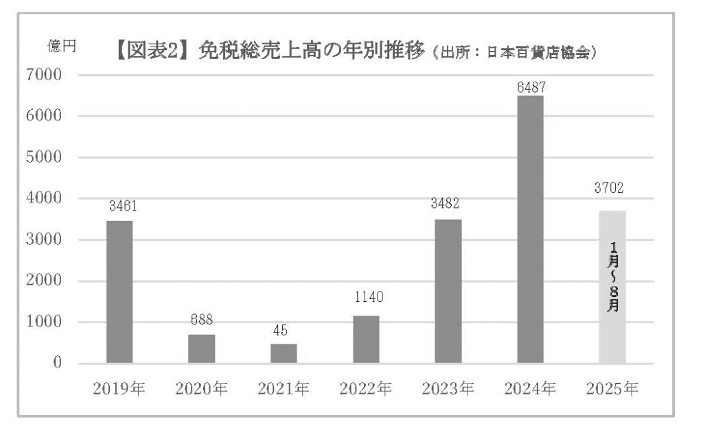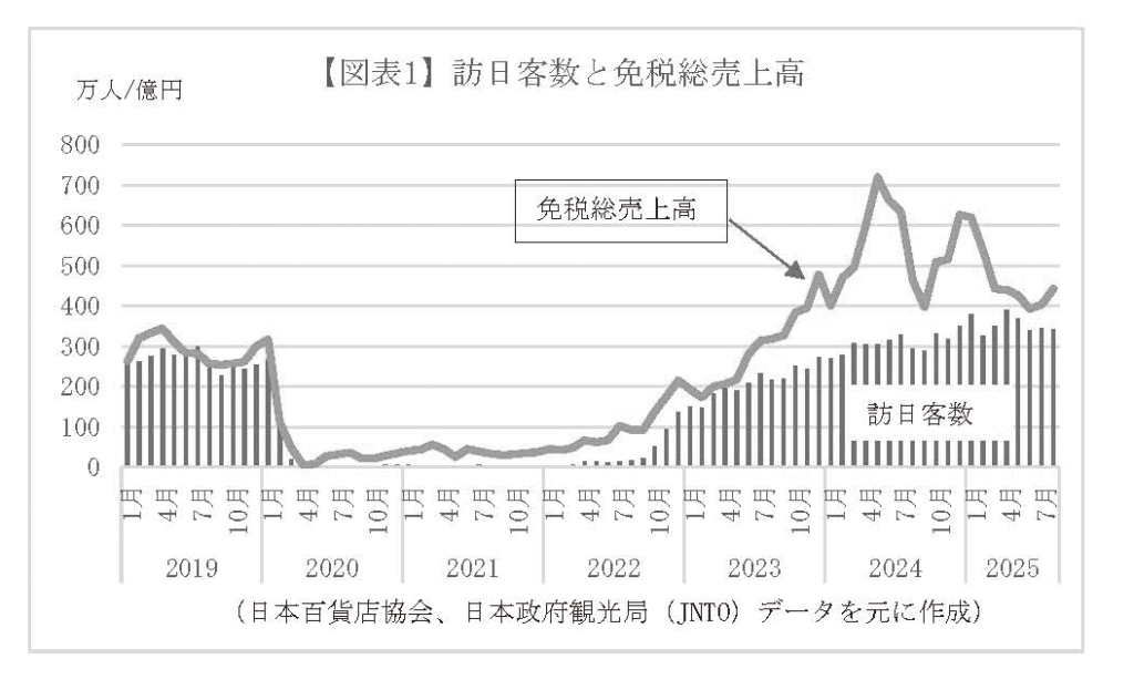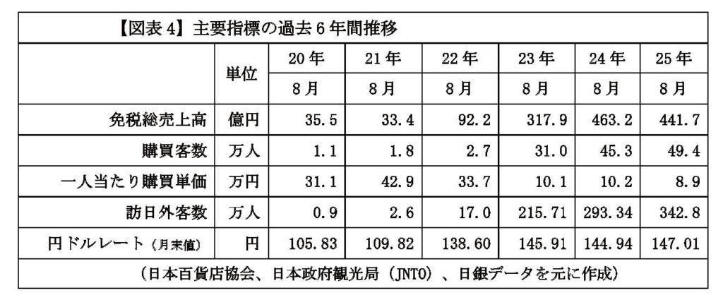 この回復の背景には、円相場が前年並みに安定して推移したことに加え、24年3月から7月にかけての歴史的な円安( 1 ドル= 1 5 0 .160円台)による一時的な需要増の反動が収束したことがある。また、訪日外国人旅行者数の増加に伴う来店客数の回復が、購買単価の下落を一定程度補完したことも寄与している。