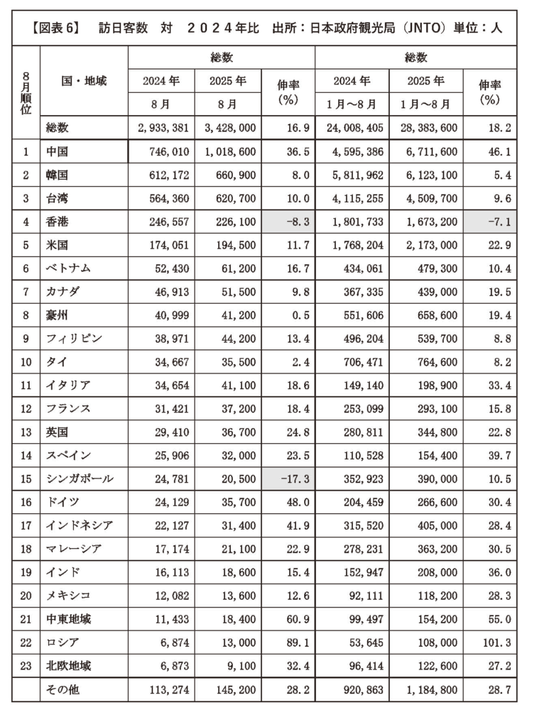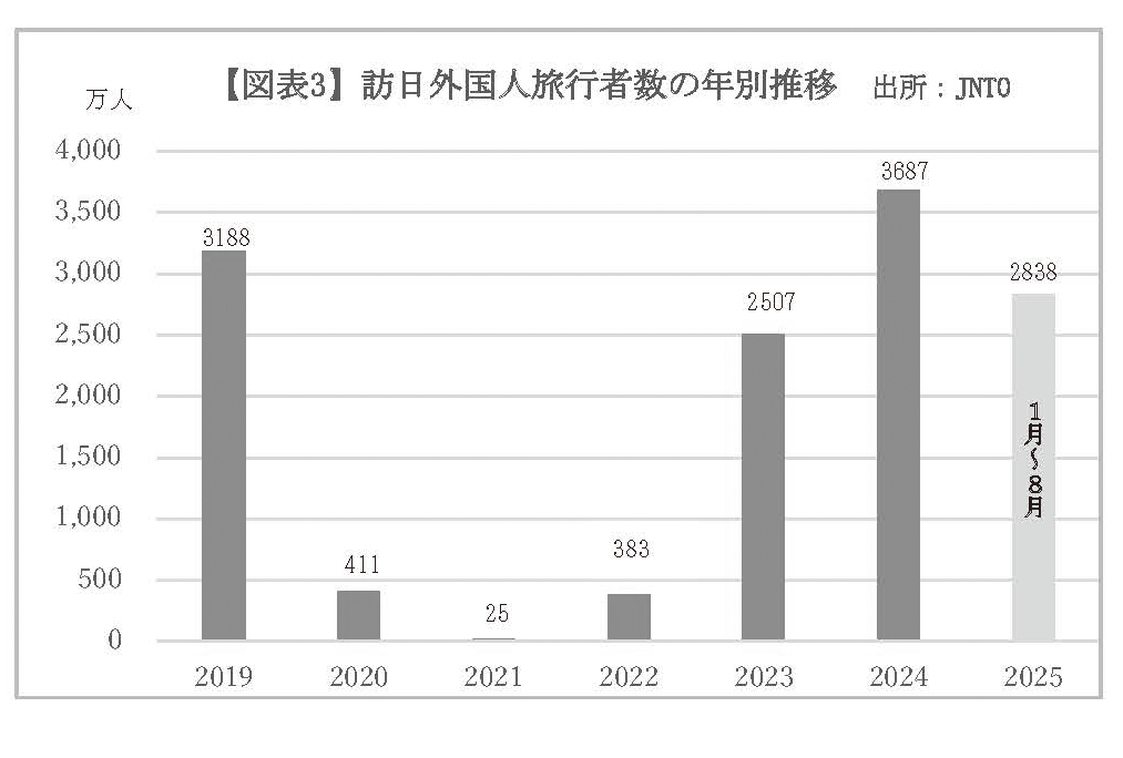 また、本年1月から8月までの累計訪日外国人旅行者数は2838万人となり、前年同期比で18.2%の増加を記録した。このままの増加ペースが継続した場合、年間訪日客数は4000万人を超える可能性が高く、政府が掲げる2030年までに6000万人という目標に向けて、大きく前進する見通しである。