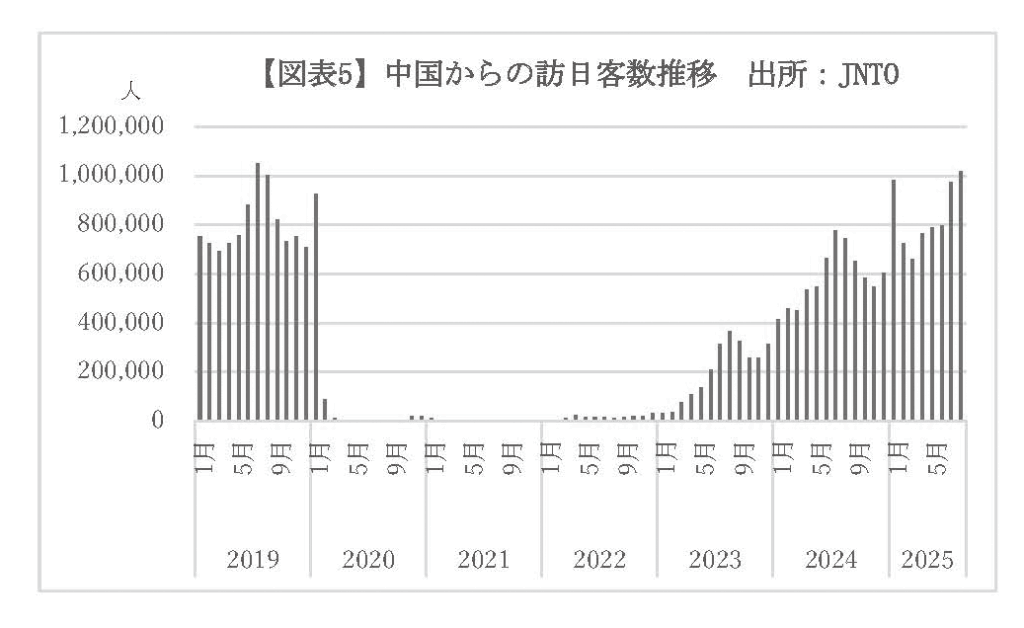 中国からの訪日外客数は1018600人(前年同月比36.5%増)となり、19年8月以来初めて100万人を突破し、同年7 月の過去最高105万人に迫った。運城〜中部間の新規就航や西安〜福岡間の復便など地方路線の拡充に加え、クルーズ船の寄港増加などが奏功し、8月として過去最高を記録した。