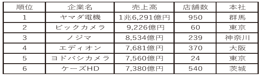 池袋東口を舞台に勃発するのは、前号で掲出した家電量販店「売上高ランキング」の上位3社の争いだ。念の為おさらいをしておこう。