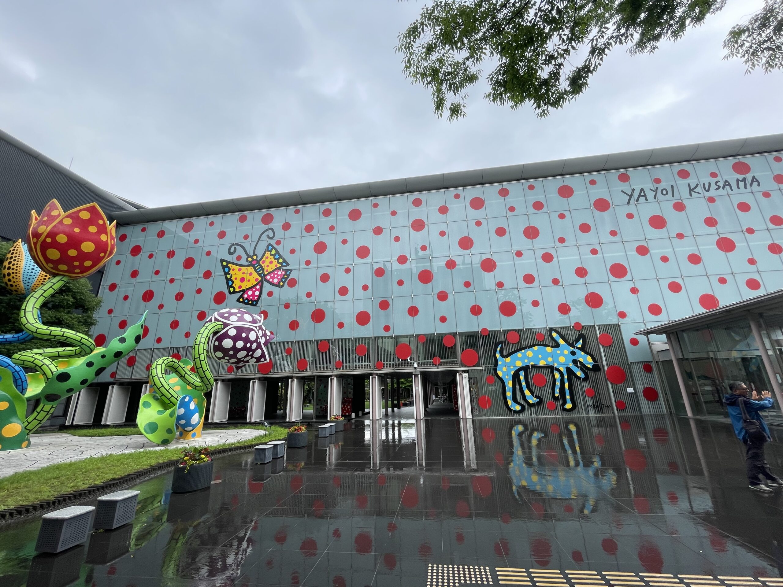 公園の遊具と花とを掛け合わせたら、こんな風に造形が変化するのだろうか。そう感じさせる巨大なオブジェが、派手な色彩と大小の水玉模様をまとって並んでいる。その奥の横に長い角張った建物も、やはり外壁の前面に赤い水玉を張り付けていた。