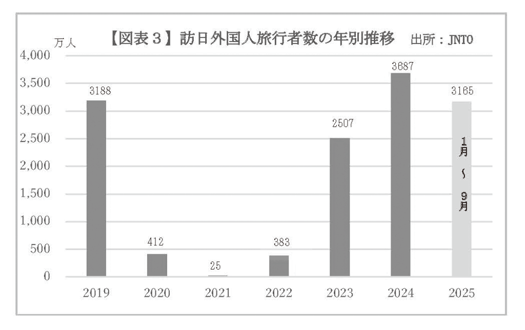 1月から9月までの累計訪日客数は3165万人に達し、前年同期比17.7%増。年間3000万人突破は過去最速で、現行ペースが続けば年間4000万人超も視野に入る。政府が掲げる「2030年に6000万人」の目標に向け、順調な推移を見せている。