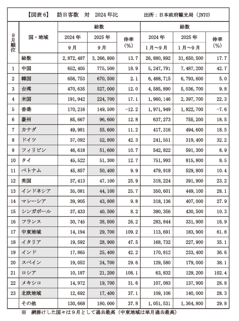 9月は学校休暇直後の閑散期に加え、東アジアでの台風による航空便の乱れもあったが、訪日需要は堅調。中国(同12.3万人増)、台湾(同5.6万人増)、米国(同3.3万人増)に加え、中東地域やドイツ、ロシアなどからの旅行者数が伸び、全体の増加を後押しした。