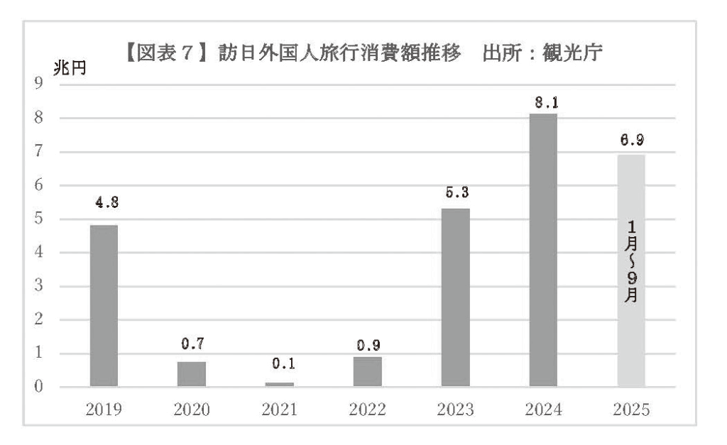 観光庁が10月15 日に発表した2025年7~9月期の訪日外国人旅行者による国内消費額(インバウンド消費)の一次速報値は、前年同期比11.1%増の2兆1310億円となり、同時期として過去最高を記録した。この結果、1月~9月までの累計インバウンド消費額は6兆9156億円となり、前年年間消費額の85%の水準に達した。