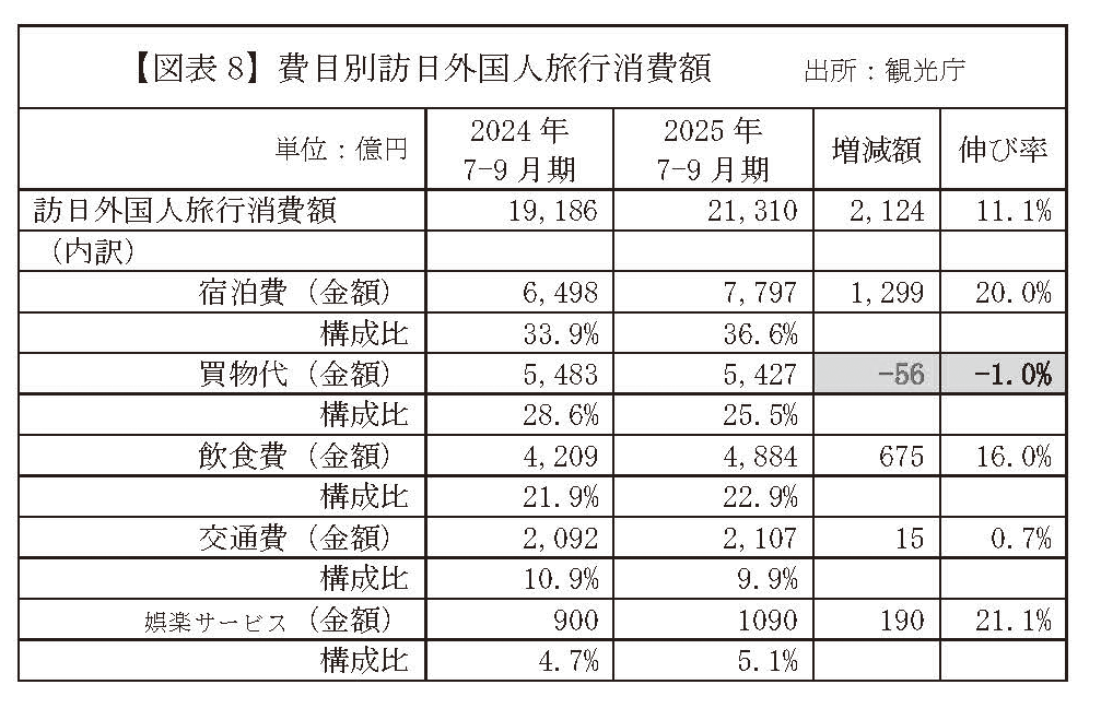 訪日外国人旅行者の消費傾向に変化が見られる。観光庁によると、25年7~9月期の費目別構成比では、宿泊費が36.6%と最も高く、次いで買物代が25.5%、飲食費が22.9%となった。