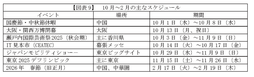 このほか、アジア最大級のIT見本市「CEAT E C 」( 幕張メッセ)、自動車関連の展示会「ジャパンモビリティショー」(東京ビッグサイト)、日本初開催となる聴覚障がい者の国際スポーツ大会「東京2025デフリンピック」など、国内外から注目を集めるイベントが続く。