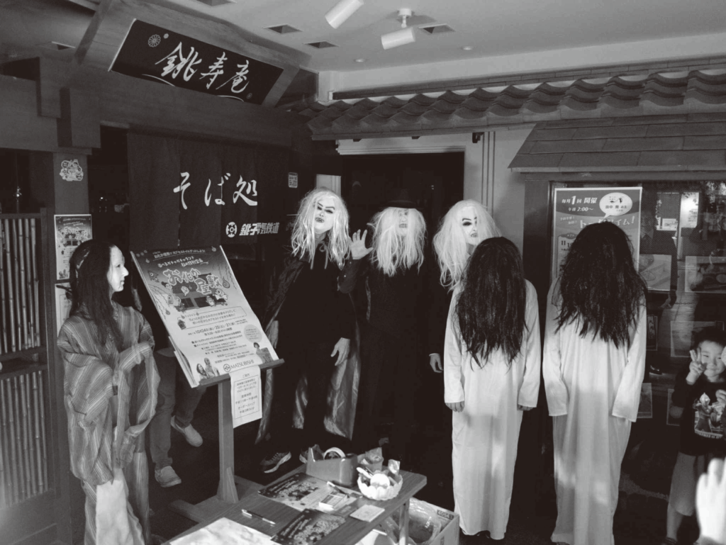 化けの攻撃をクリアして、呪いの祠ほこらからカプセルトイを持ち帰れ!!」という、ミッションをクリアする体感型イベントです。10月24日(金)、25日(土)、翌31日(金)の3日間、ハロウィン連動企画として、デパート新聞社主催により三重県津市の松菱百貨店7階の蕎麦屋「銚寿庵」を舞台に「お化か屋敷」を開催しました。